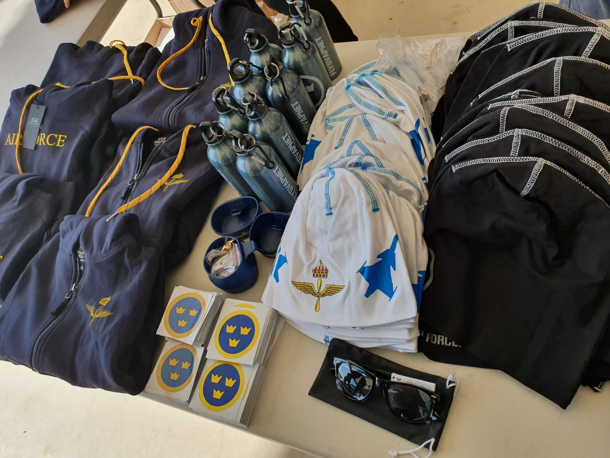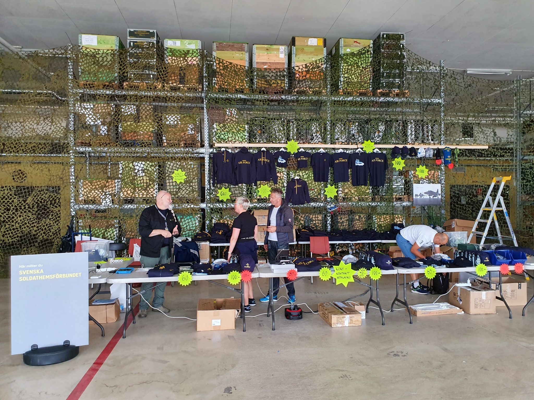 Förberedelserna inför försäljningen på årets flygdag har planerats in i minsta detalj av Gustaf Åkerman, Ronneby Soldathem. Föreståndare med personal har hämtats in från Arvidsjaur i norr till Revingehed i söder.